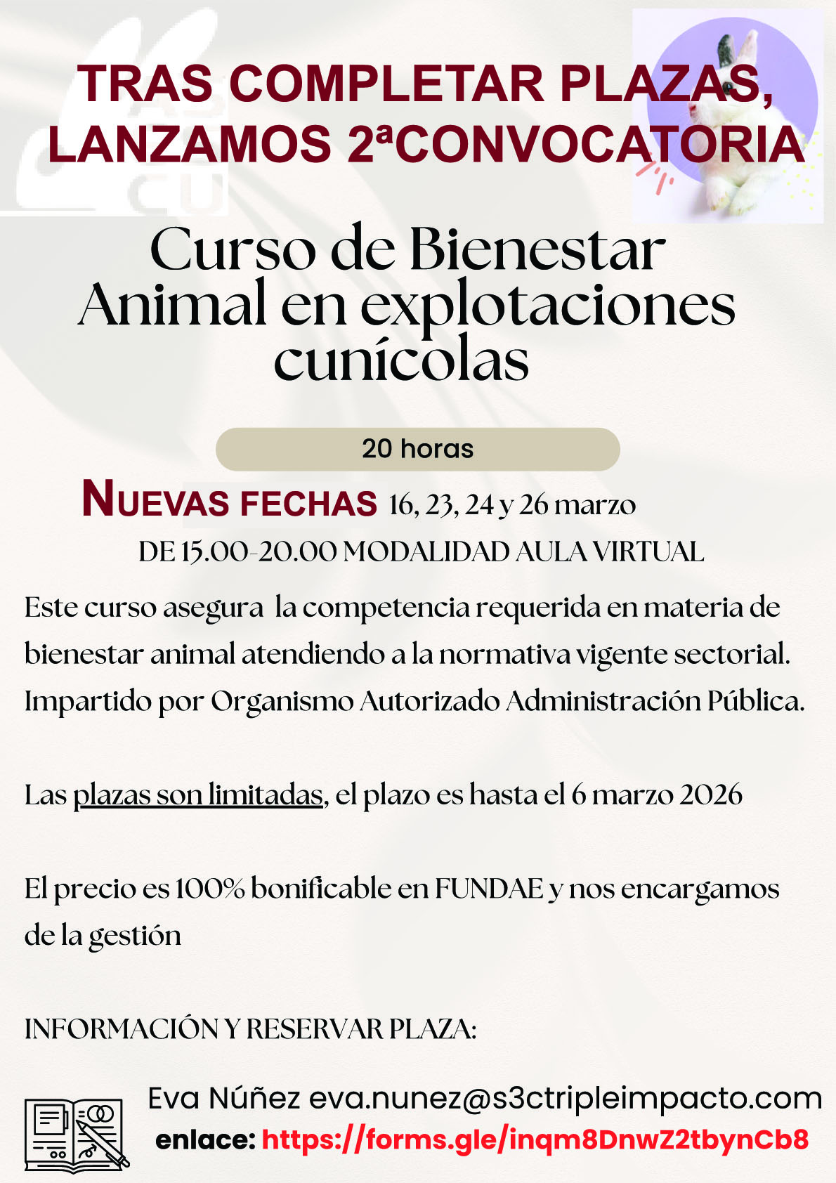 Abierta 3ª convocatoria del Curso de Bienestar Animal en Explotaciones Cunícolas