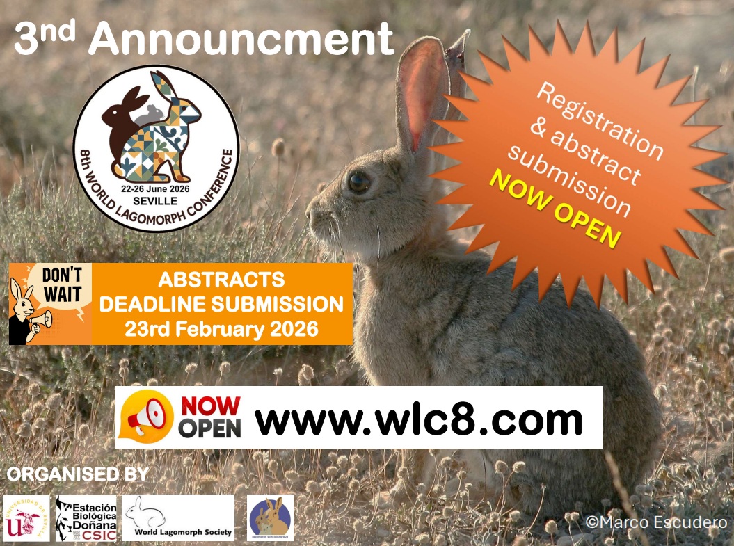8th World Lagomorph Conference Junio2026 – Sevilla La 8th World Lagomorph Conference se celebrará del 22 al 26 de junio de 2026 en Sevilla. Más información en: www.wlc8.com ASC2026-01-24T11:47:58+02:00 Artículos relacionados