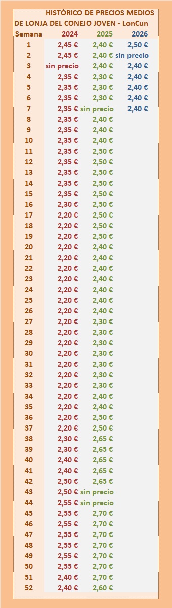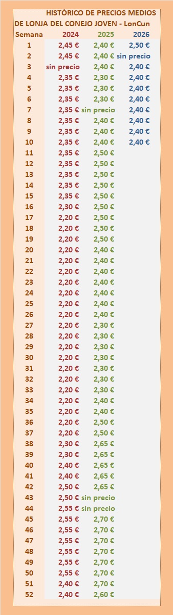 La Mesa Nacional de Precios para el Conejo, LONCUN, anotó un importante aumento de 10 céntimos, cotizando a 1,75 euros. Las cotizaciones en las distintas lonjas nacionales van desde 1,65 euros a 1,75 por kilo/vivo.